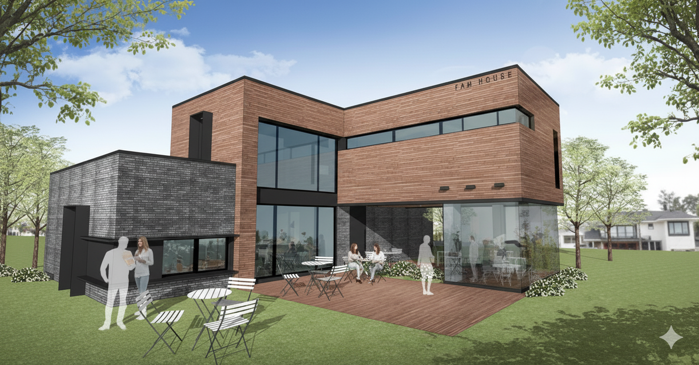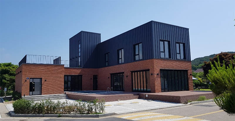 대부도 팬션단지내에 계획된 프로젝트로서 지상2층이며, 벽돌과 징크를 외장에 활용함으로서 모던한 디자인으로 계획하였다.