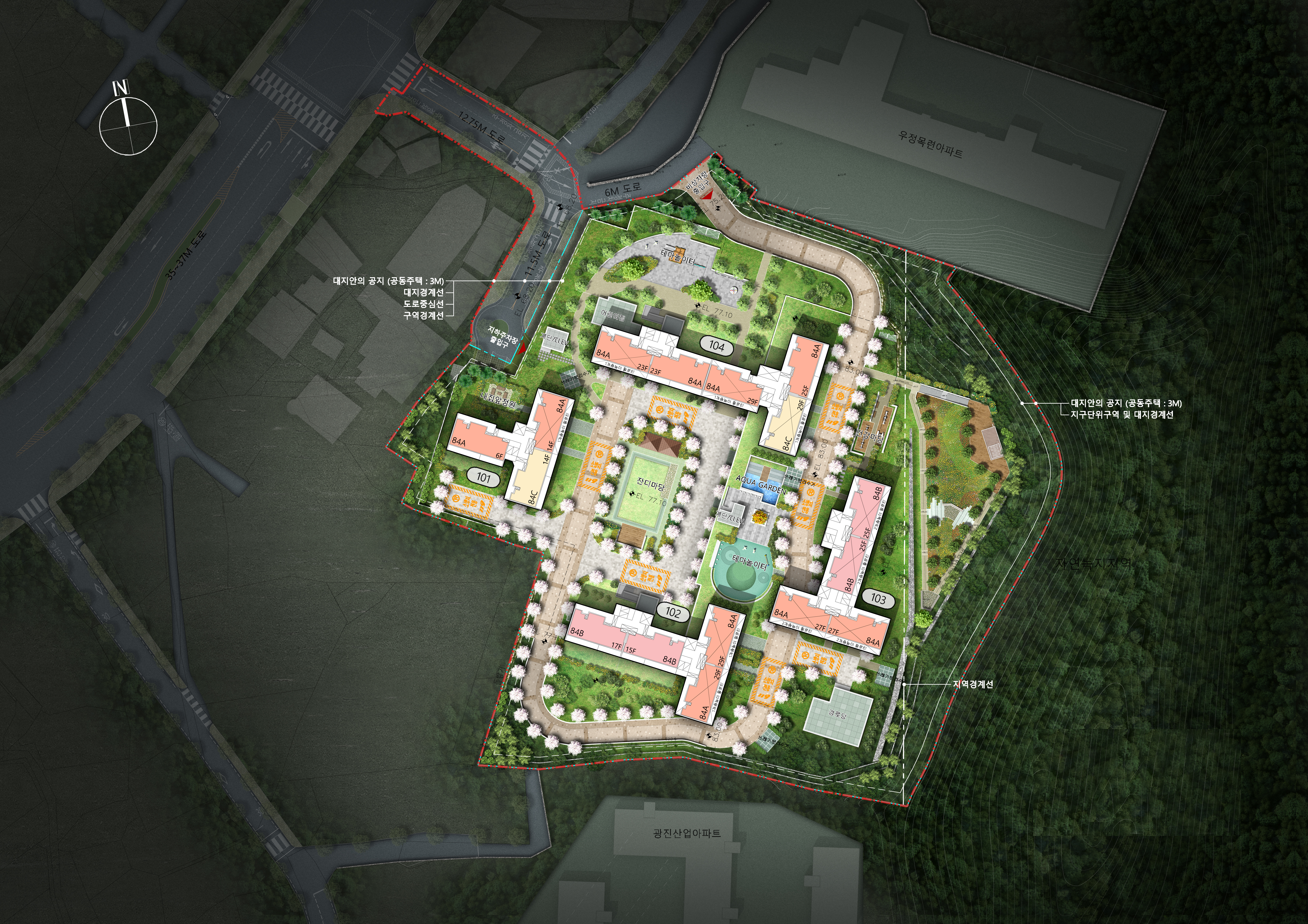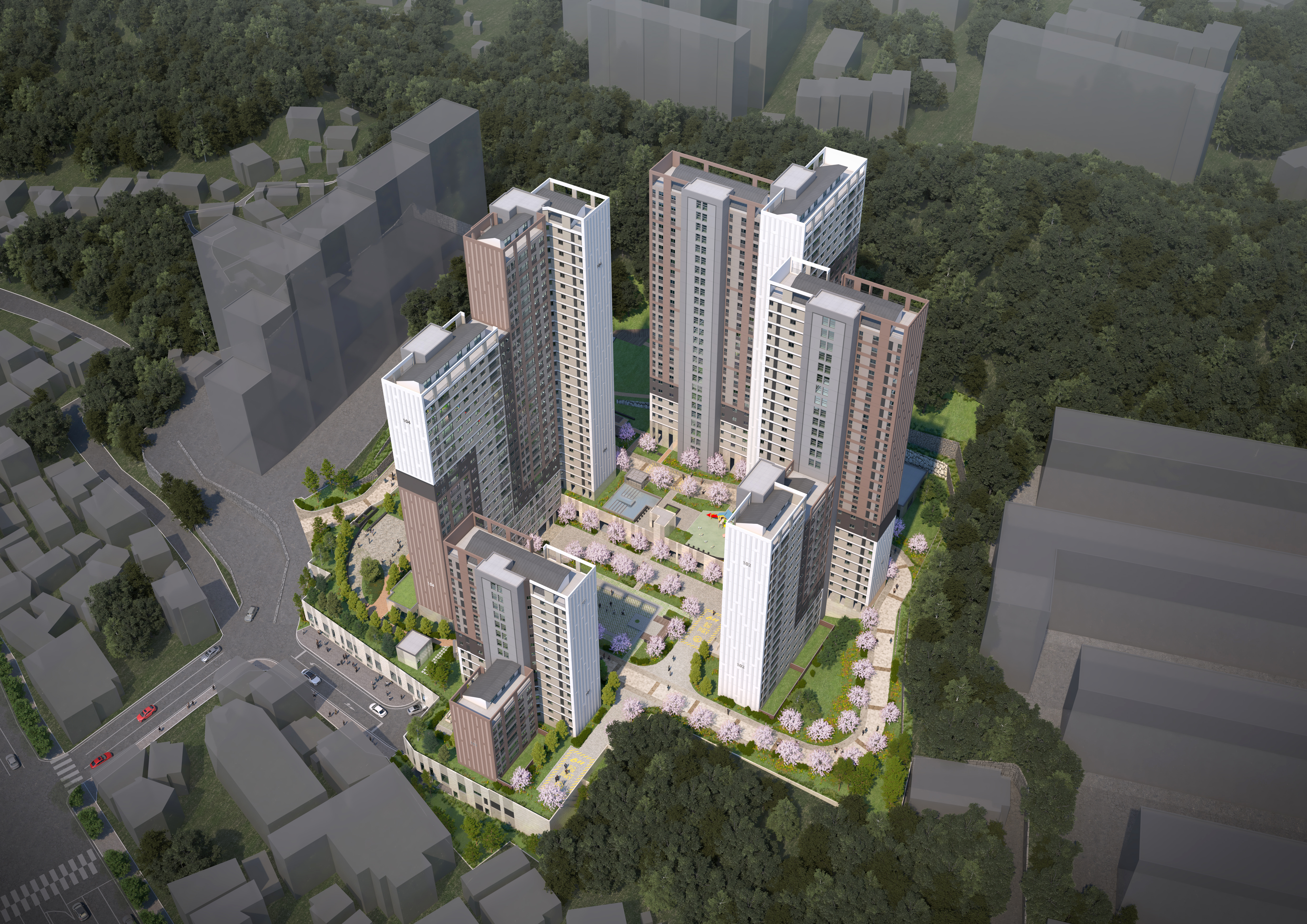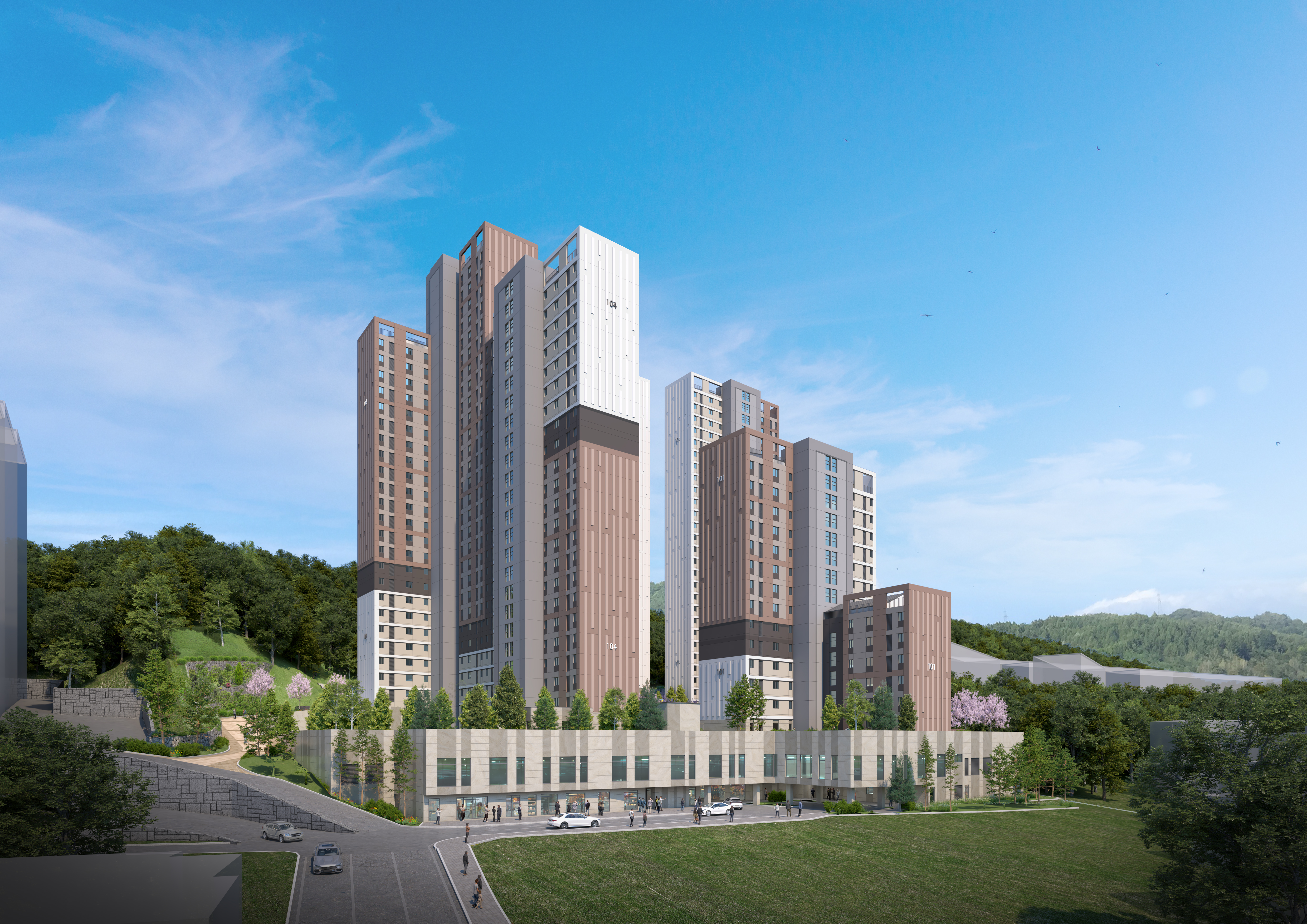 주변과 조화를 고려한 건물의 층 변화는 부드러운 스카이 라인과 뒷 산과의 풍경에 자연스럽게 동화 되도록 배치와 통경축을 계획하였다.