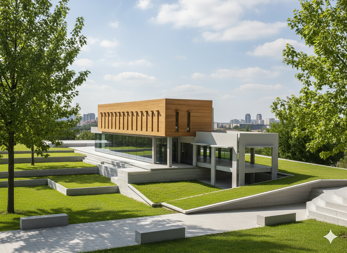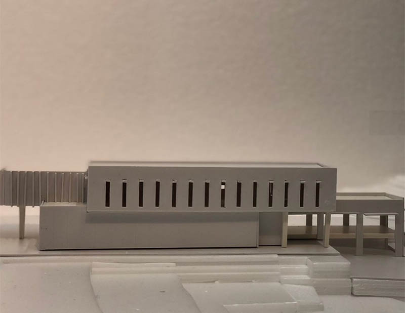 공중에 떠 있는 착각이 들도록 상부는 하부보다 돌출되어 형성하고 저층은 나무의 수직적 요소를 반영 하였다.
